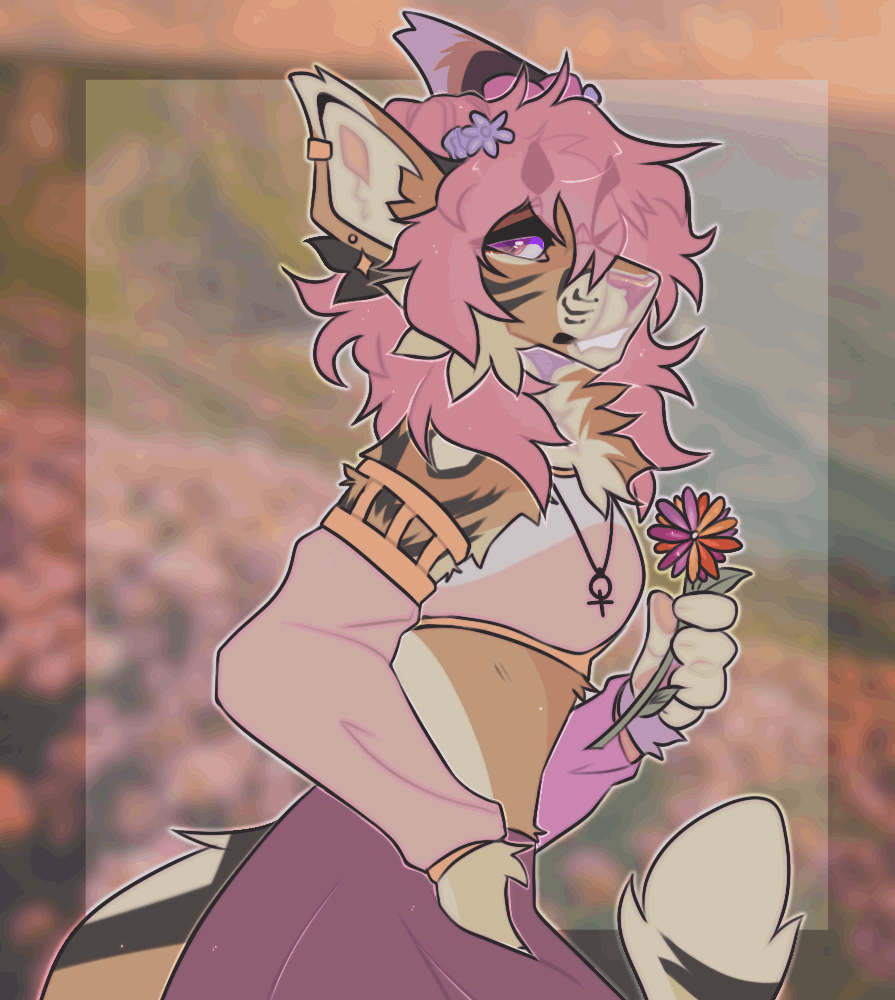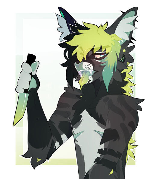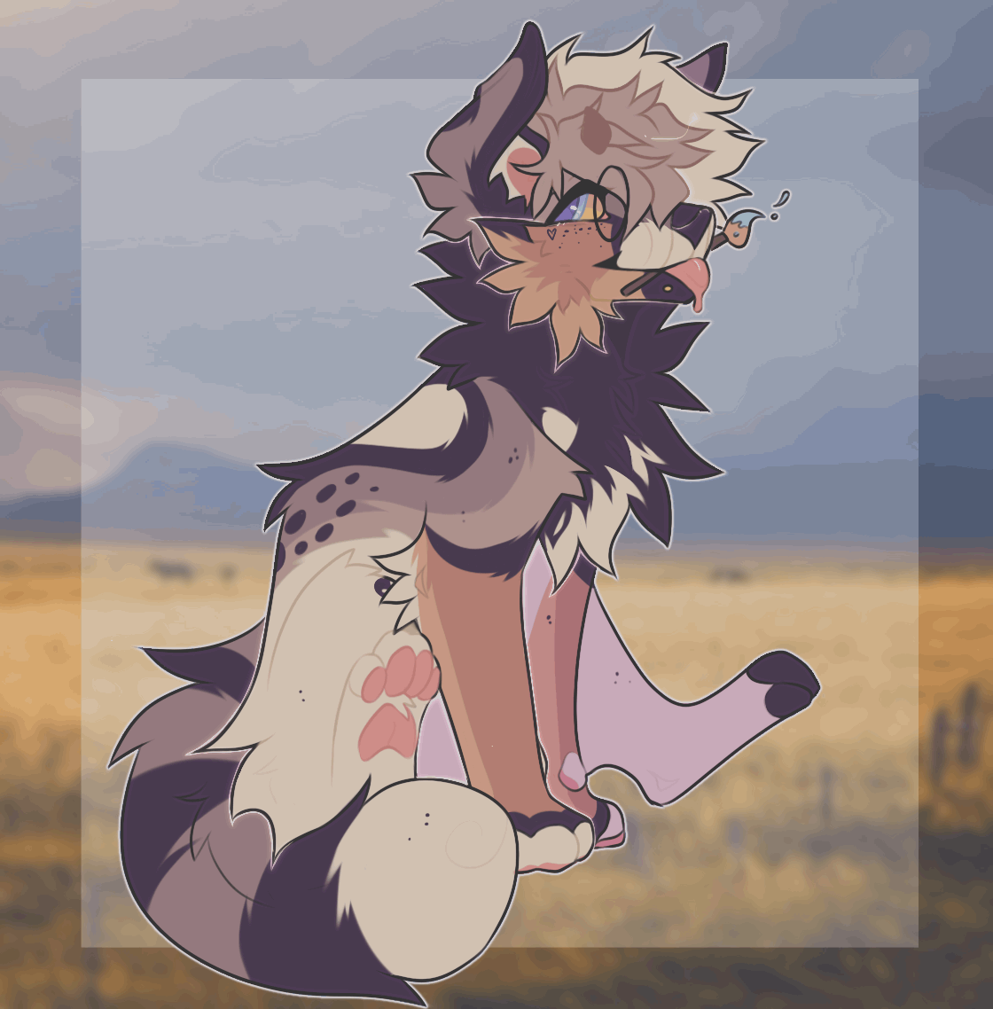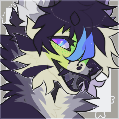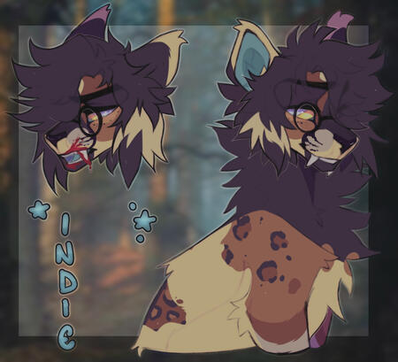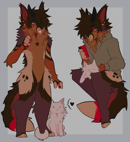 feral fullbody, name, color picker, tail vieweye +paw ref, like's + dislike's, 2 items, and extra info