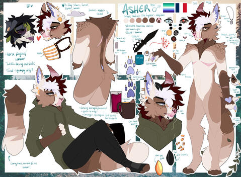 anthro fullbody, tail view name, color picker, eye +paw ref, like's + dislike's, 2 items, and extra info